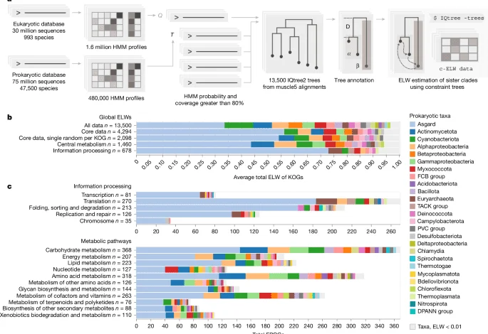 Unless otherwise stated, all subsequent steps were carried out using custom Python v.3.9 scripts, with taxonomy and tree parsing carried out using ete3 (ref. 76). All sequences from a eukaryotic cluster with at least ten sequences and a lowest common ancestor at the rank of ‘Superkingdom’ (NCBI taxonomy), together with all members of the homologous prokaryotic clusters identified in the HMM–HMM search with at least 80% probability and pairwise sequence coverage, forms an EPOC. As EPOCs varied in size by more than five orders of magnitude (10 to 100,000 sequences), robust data subsampling is necessary for accurate downstream MSA generation and tree construction. We used a variant of the ‘prune-and-align’ strategy described above for profile generation taking into account the taxonomic distribution of the constituent sequences.