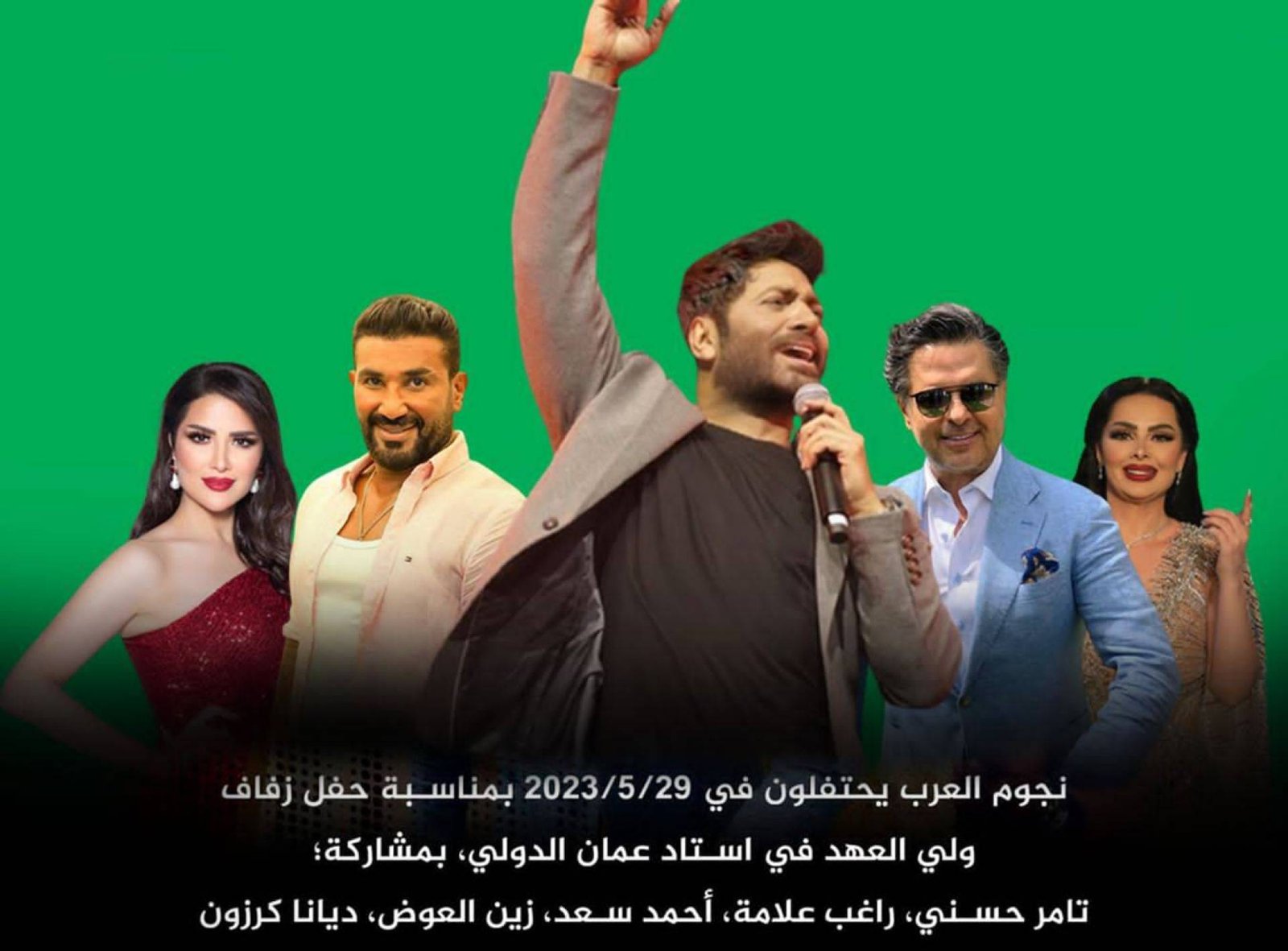 وتضم مجموعة الفنانين كلاً من النجوم، تامر حسني، راعب علامة، أحمد سعد، ديانا كرزون، زين العوض.ويفتتح تامر حسني الاحتفالية فى الساعة الثامنة مساء يوم الاثنين 29 أيار (مايو) الجارى بستاد عمَّان الدولي في المدينة الرياضية وهو متاح لجميع أفراد الشعب الأردني وكافة الجنسيات العربية المقيمة بالمملكة الأردنية الهاشمية لذا يعد الأضخم على الإطلاق في العالم.